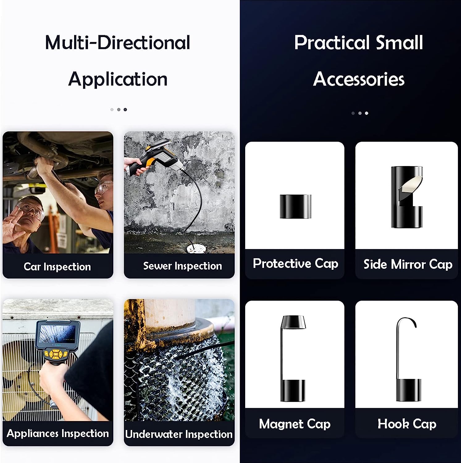 آندوسکوپی دو دوربین همراه با مانیتور ابزارهای بازرسی حرفه ای هستند که معمولا برای ماشین (نگاه کردن به داخل و اطراف موتور)، بازرسی فاضلاب، بررسی لوله کشی داخلی و پشت موتور، و بازرسی خانه (قالب، سیم کشی، یا لوله کشی) استفاده می شود.